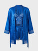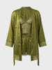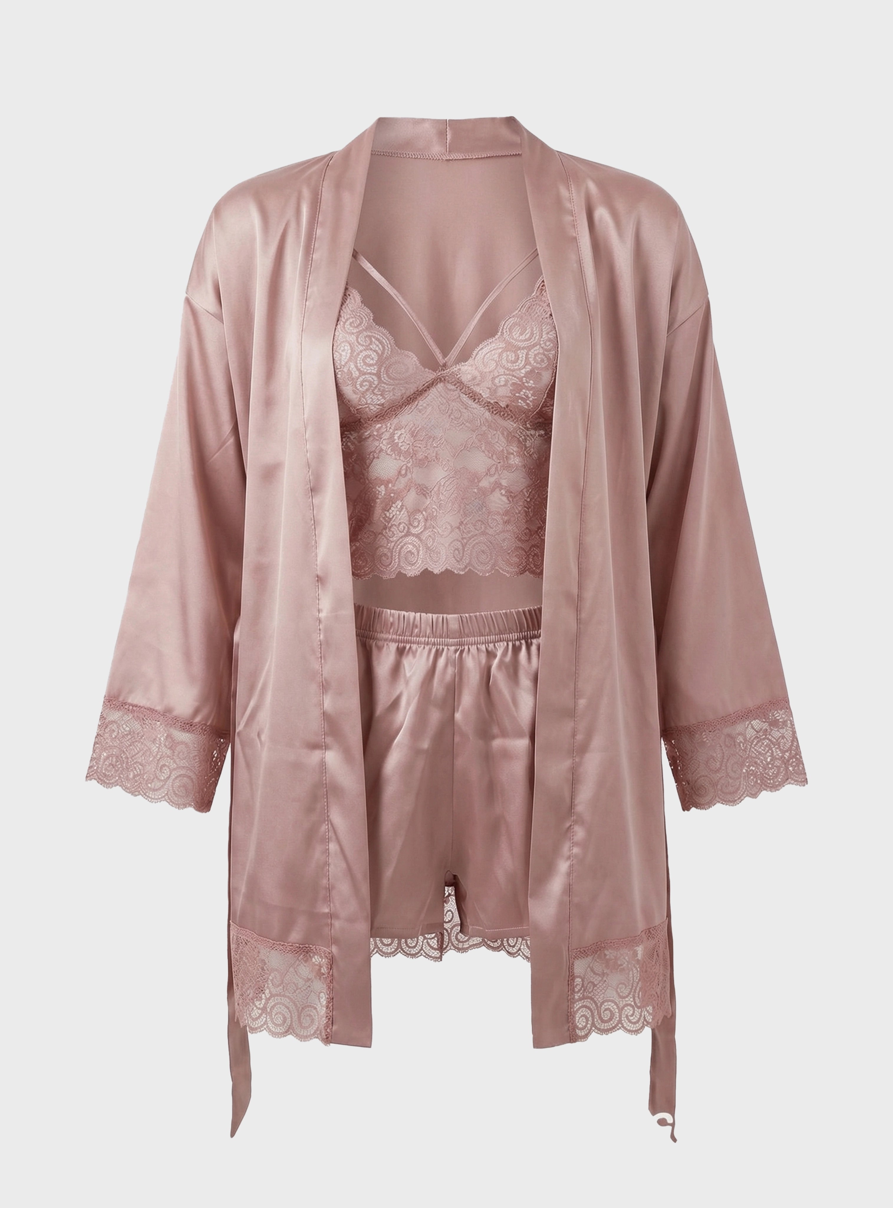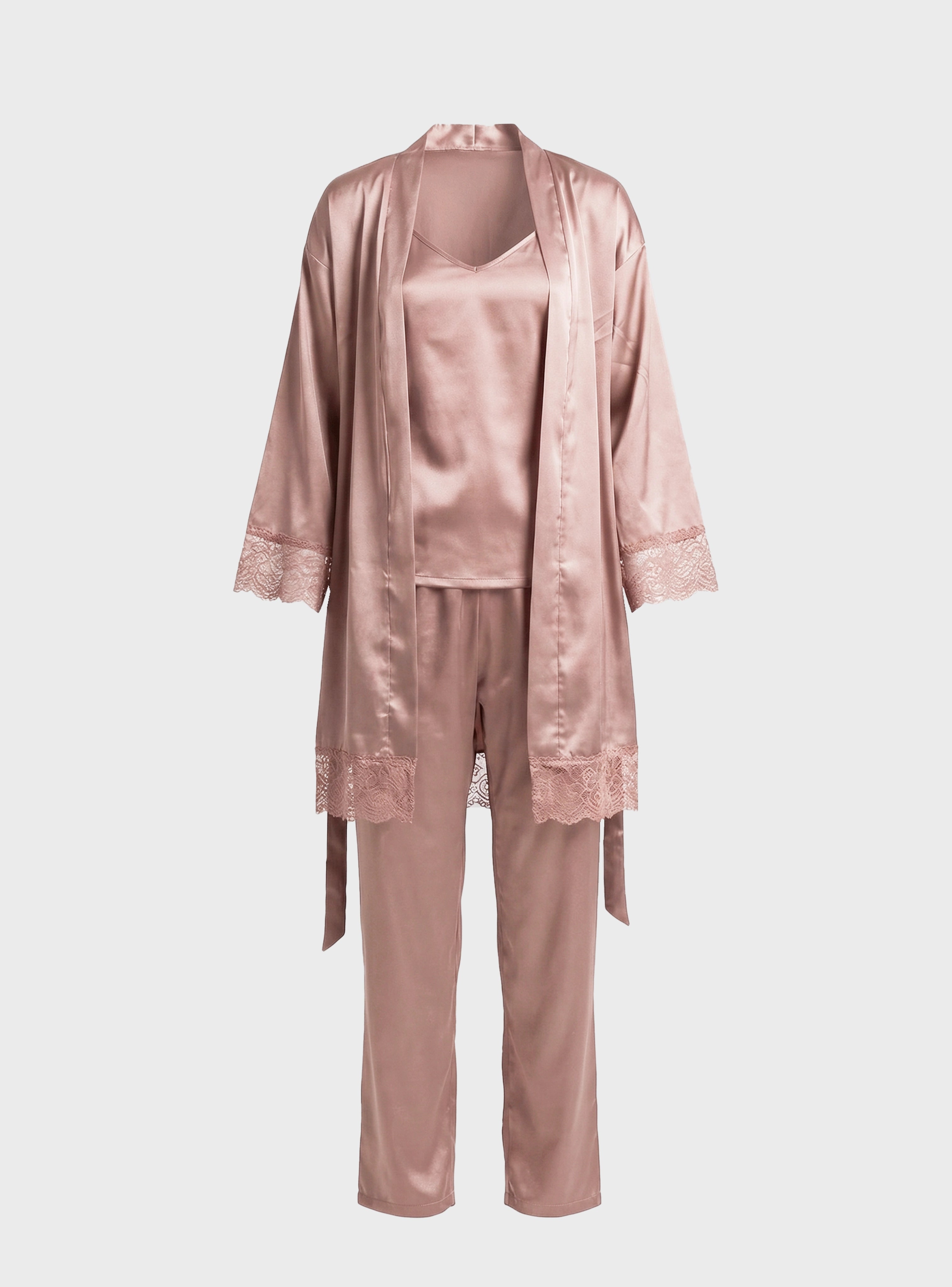 Completing the look is a graceful robe with lace details, adding a touch of sophistication and making the set perfect for relaxing at home while still feeling elegant.