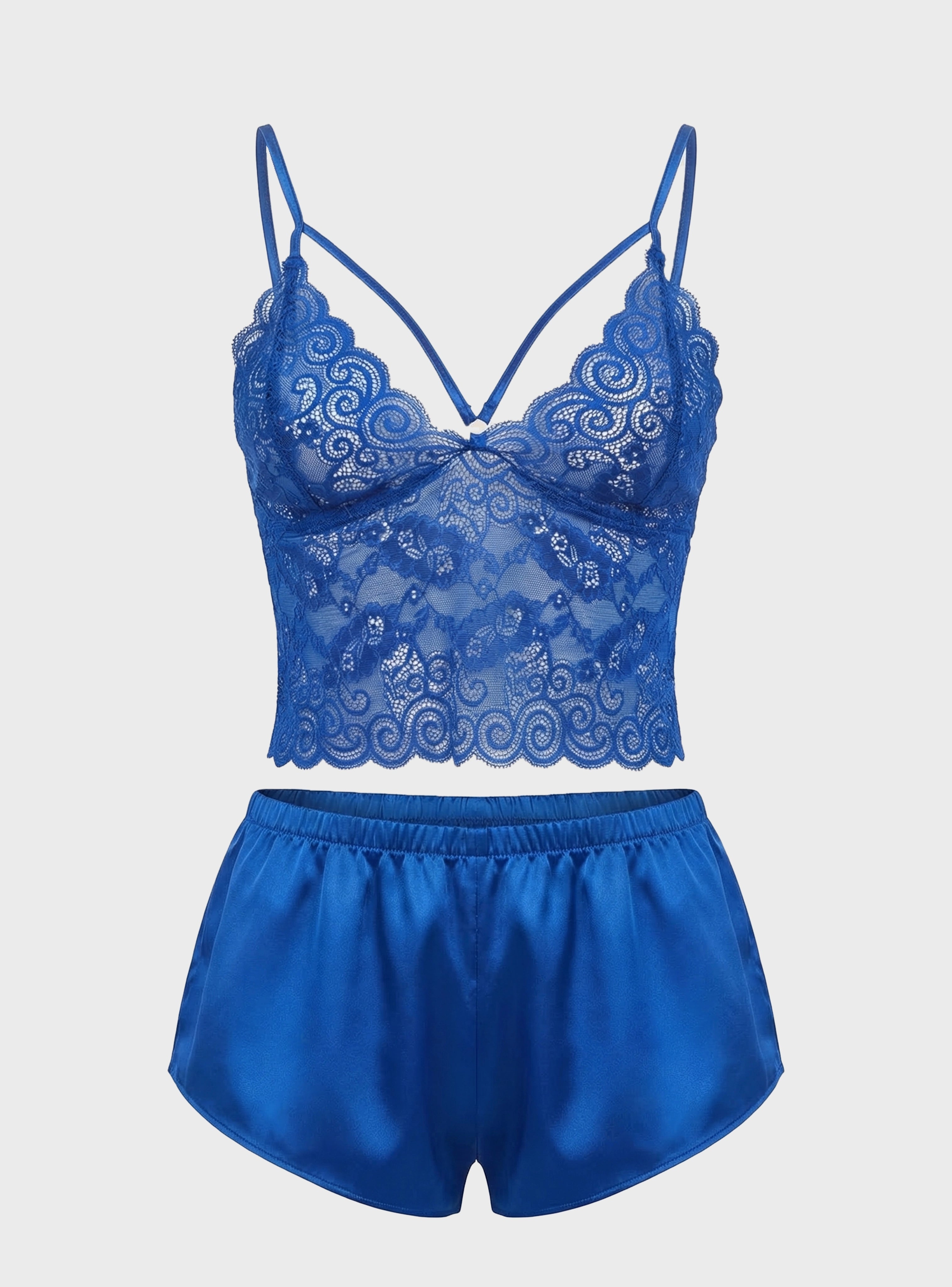 This refined set features a delicate lace top that adds a soft, feminine charm, paired with a smooth satin camisole for a comfortable and elegant feel. The set also includes lightweight shorts and long pants, allowing you to choose the perfect option for different moods and seasons.