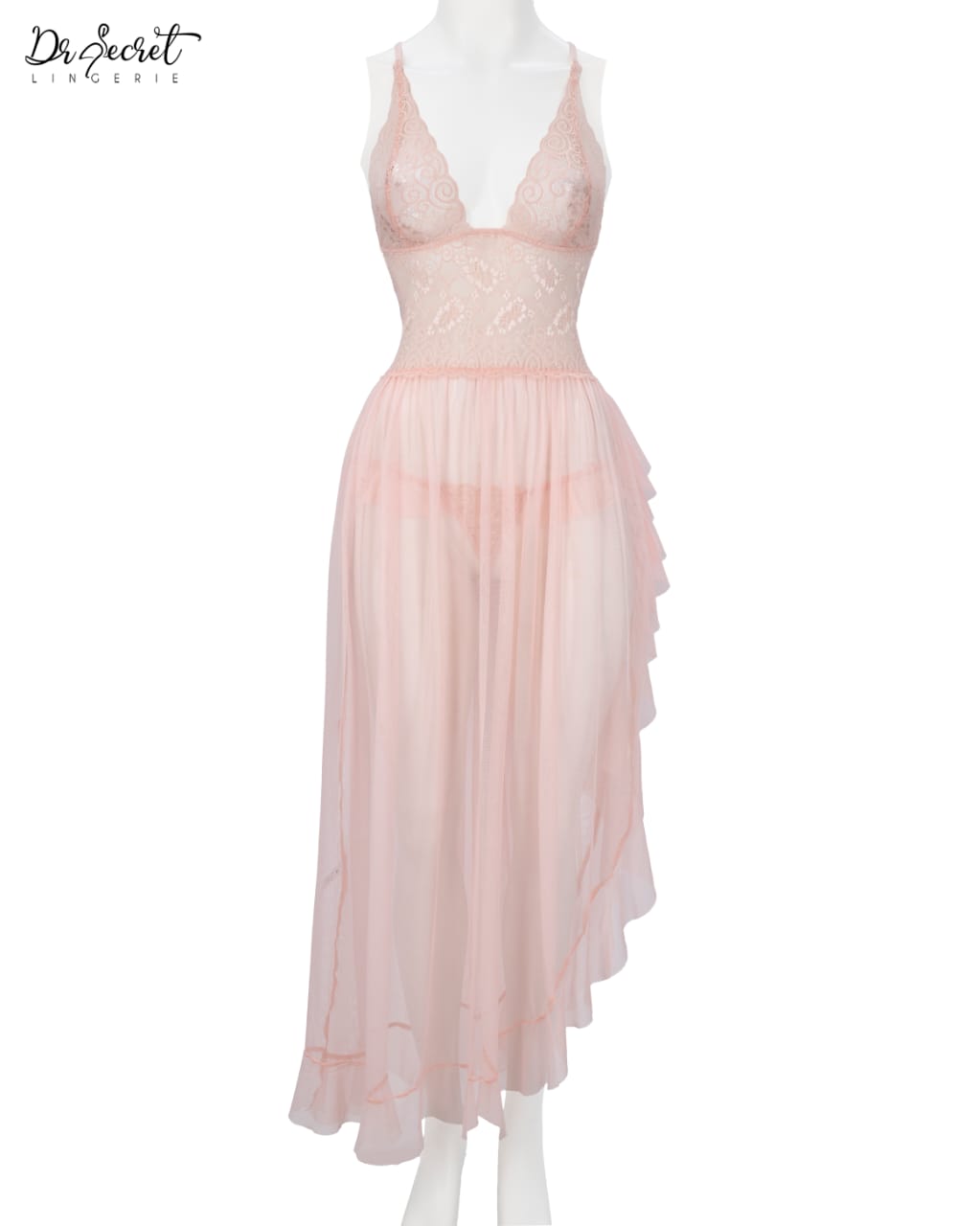 Embrace sophistication and allure with this exquisite nightgown crafted from soft powernet and intricate lace. The fitted lace bodice gracefully highlights your silhouette, while the sheer asymmetrical skirt flows elegantly with every movement, offering a captivating mix of delicacy and sensuality.