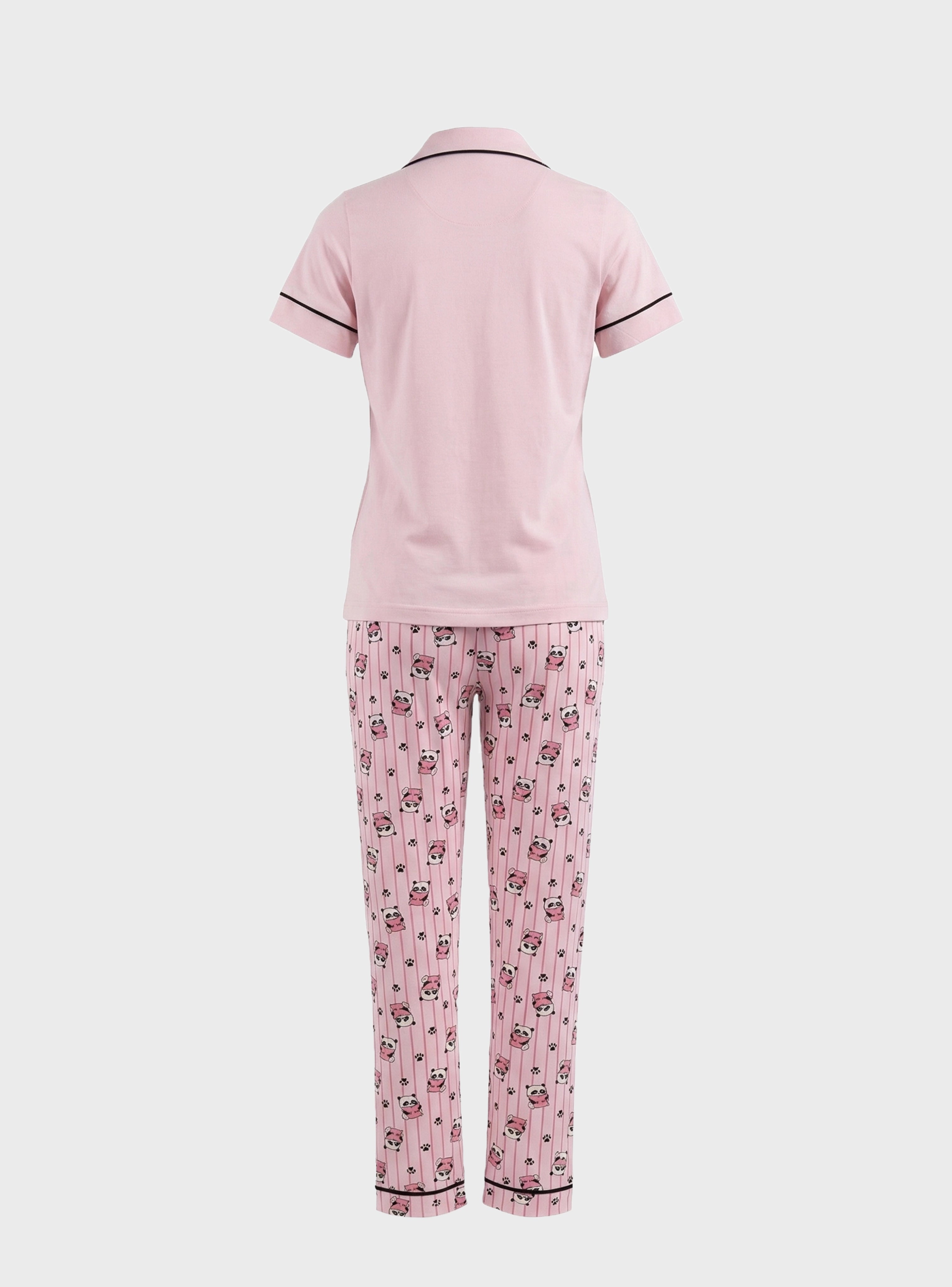 The top features a short-sleeve button-up design with a classic collar, finished with elegant contrast piping that adds a stylish detail to the look. A cute panda illustration on the chest gives the design a charming and playful character.