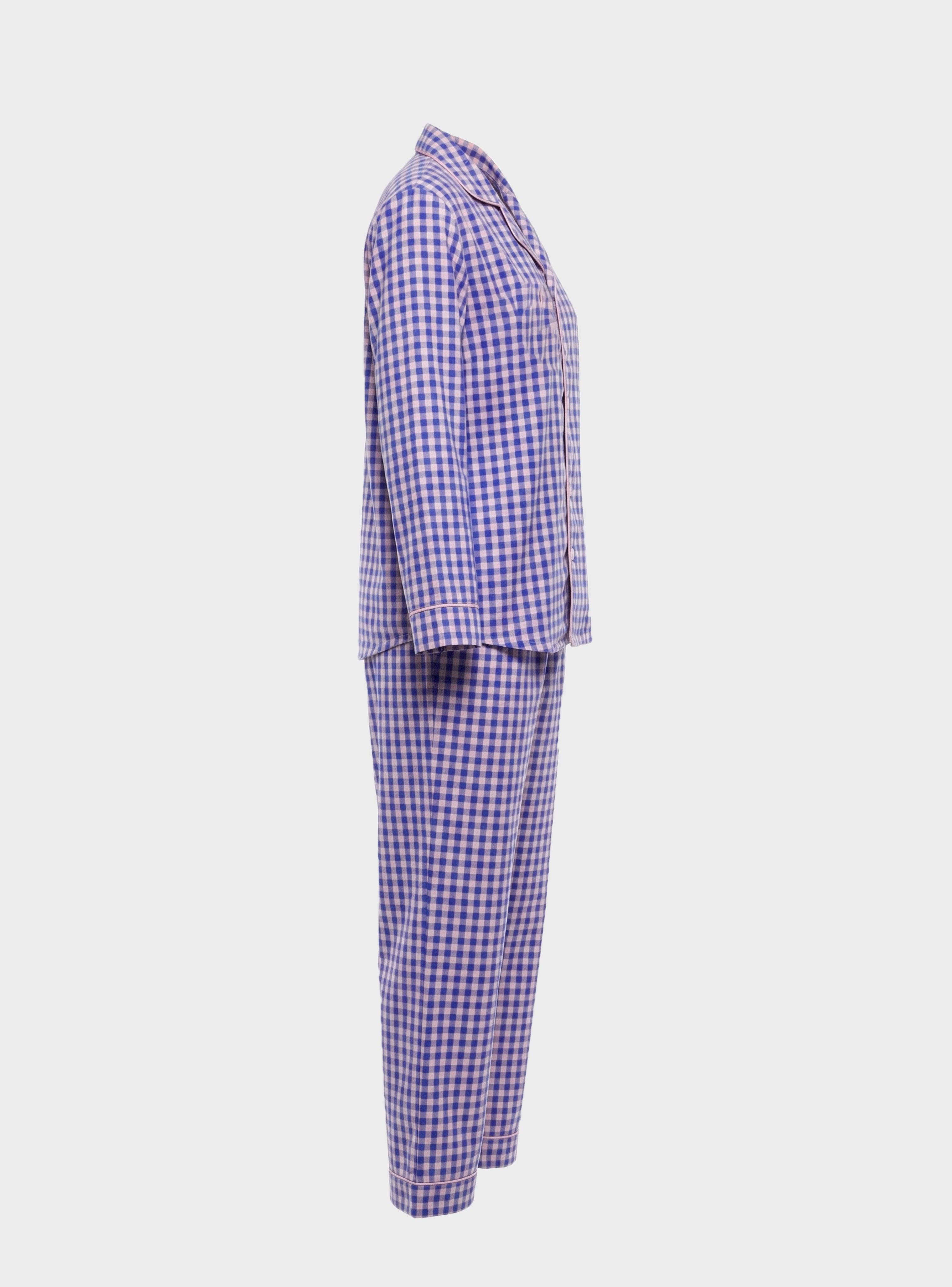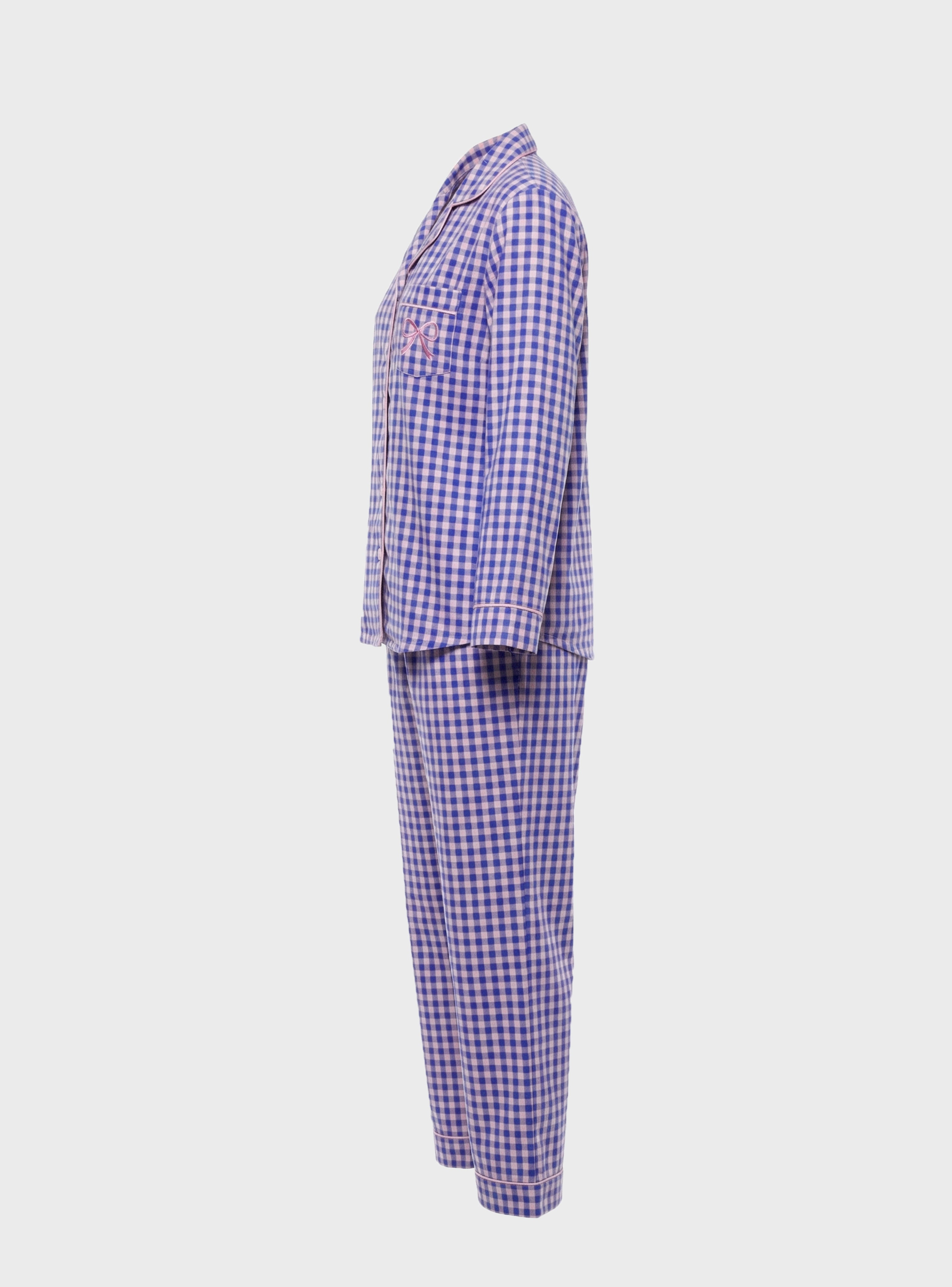 The top features a long-sleeve button-up shirt with a classic collar, finished with delicate contrast piping that enhances the refined look of the design. The plaid pattern in soft blue and peach tones gives the set a modern yet classic feel, while the small decorative bow detail adds a feminine touch.